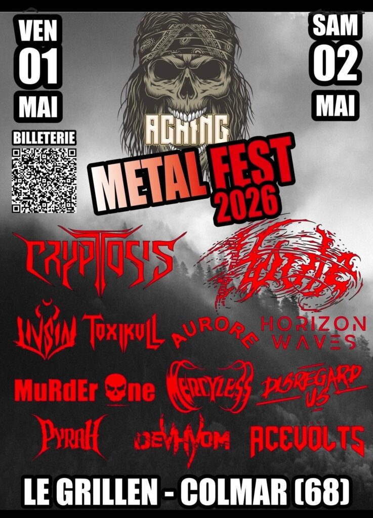 Le 1er et 2 mai 2026, le Grillen de Colmar s’apprête à redevenir l’épicentre du metal dans l’Est de la France. Porté par l’association Aching, le ACHING METAL FEST poursuit son ascension avec une troisième édition qui affirme une identité forte : croiser les générations, mélanger les esthétiques et faire dialoguer scène locale et internationale.