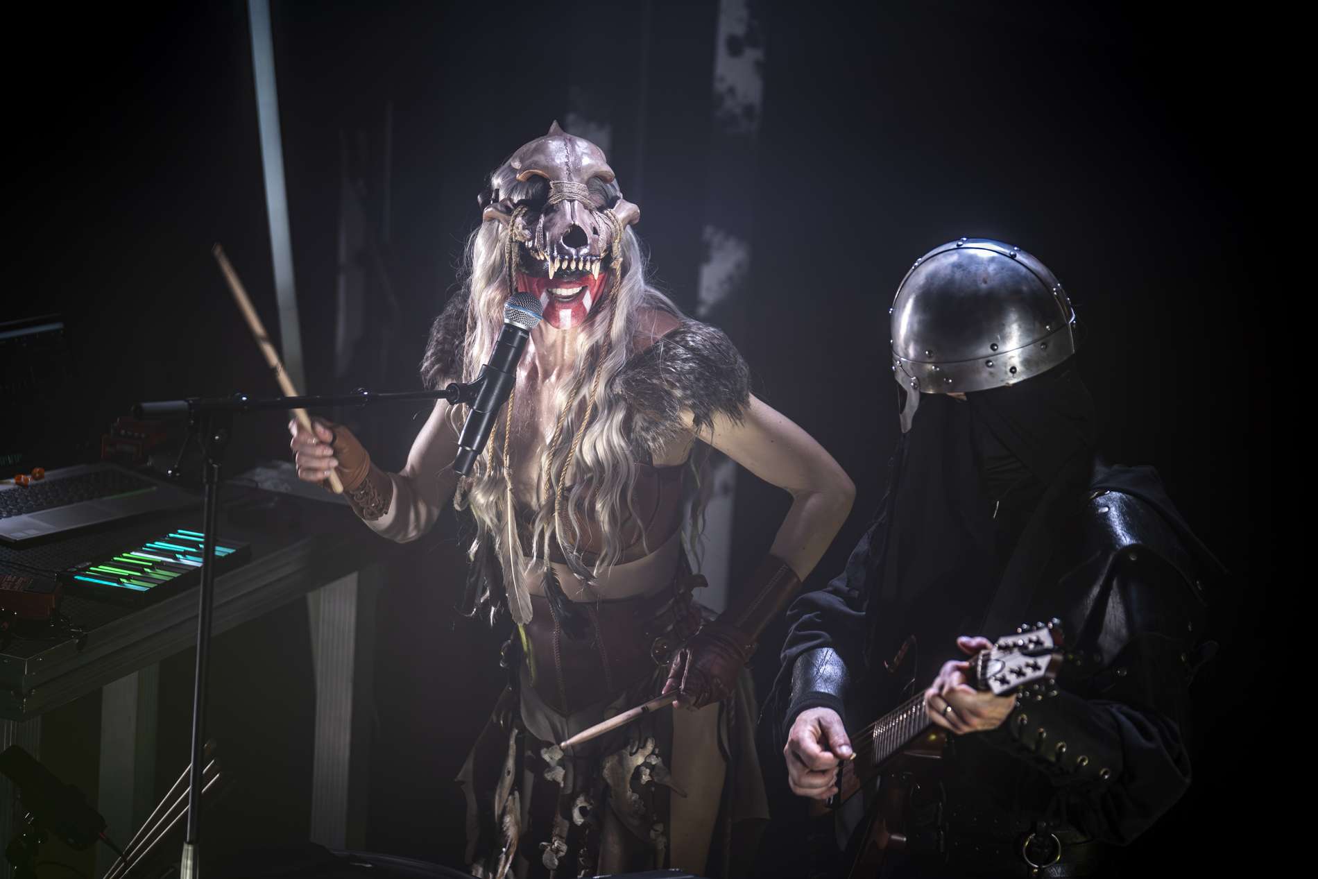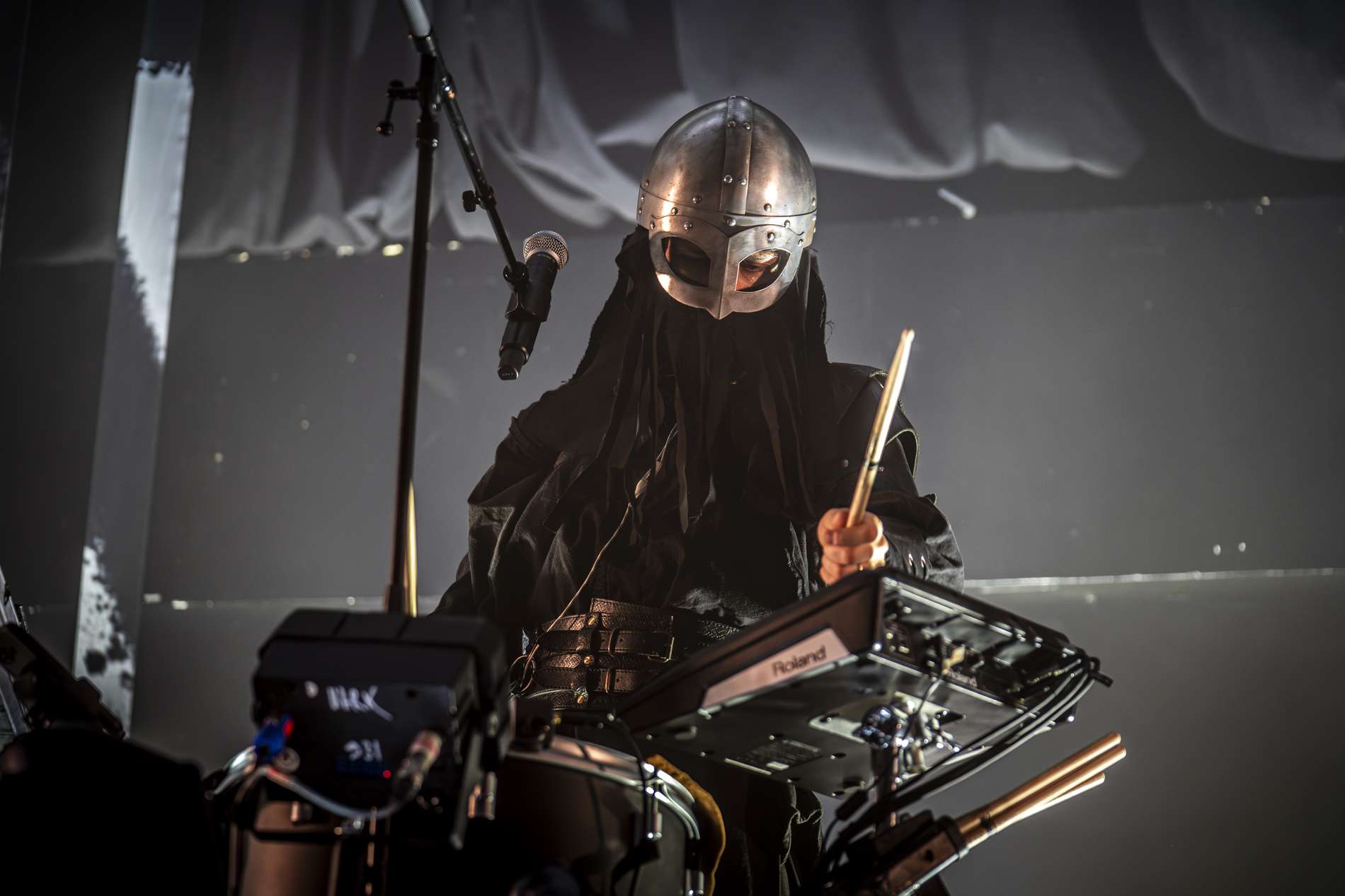 La soirée continue avec le groupe Eihwar. Le contraste est immédiat. Là où la première partie installait une bulle introspective, la seconde explose littéralement. Les premières percussions résonnent et traversent les corps, et une énergie brute envahit la salle. La transformation est totale : le public, jusqu’ici calme et presque méditatif, se réveille d’un coup. Les têtes bougent, les mains se lèvent, les cris fusent.