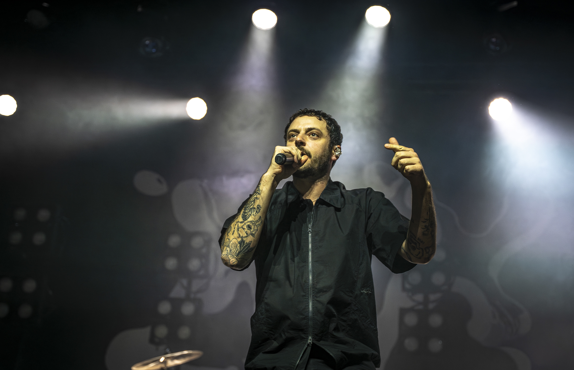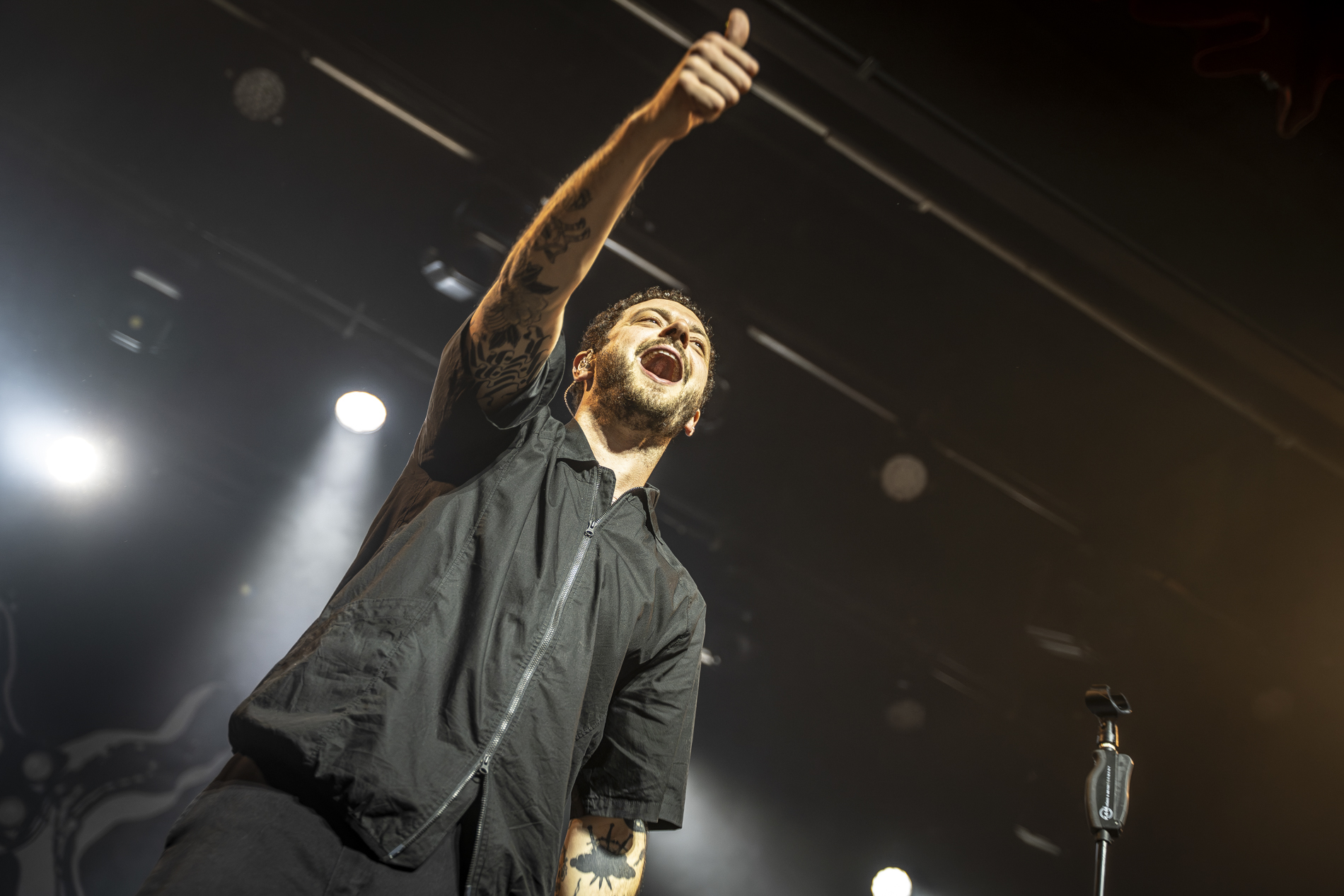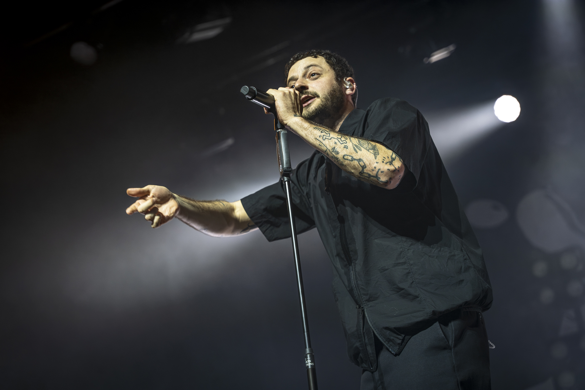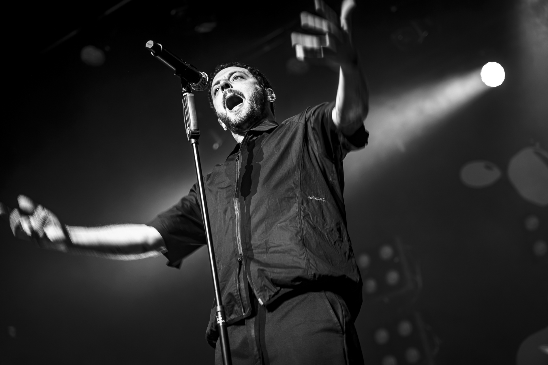 Dès les premières minutes, le ton est donné : une performance viscérale, nerveuse, presque cathartique. Les morceaux issus de son album INERTIA prennent une dimension encore plus brute en live, notamment “GOD IS AN ANIMAL”, “SELF IMMOLATION” et “BRAINROT”, brûlots politiques qui déclenchent une réaction immédiate du public. Entre deux titres, Jordan Benjamin prend le temps de s’adresser la foule, évoquant l’importance de la solidarité, de l’engagement et de la non-frontière entre les peuples, les orientations sexuelles ou encore les religions, thèmes centraux de sa musique.