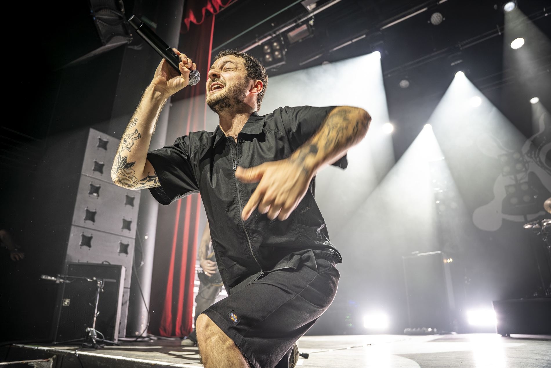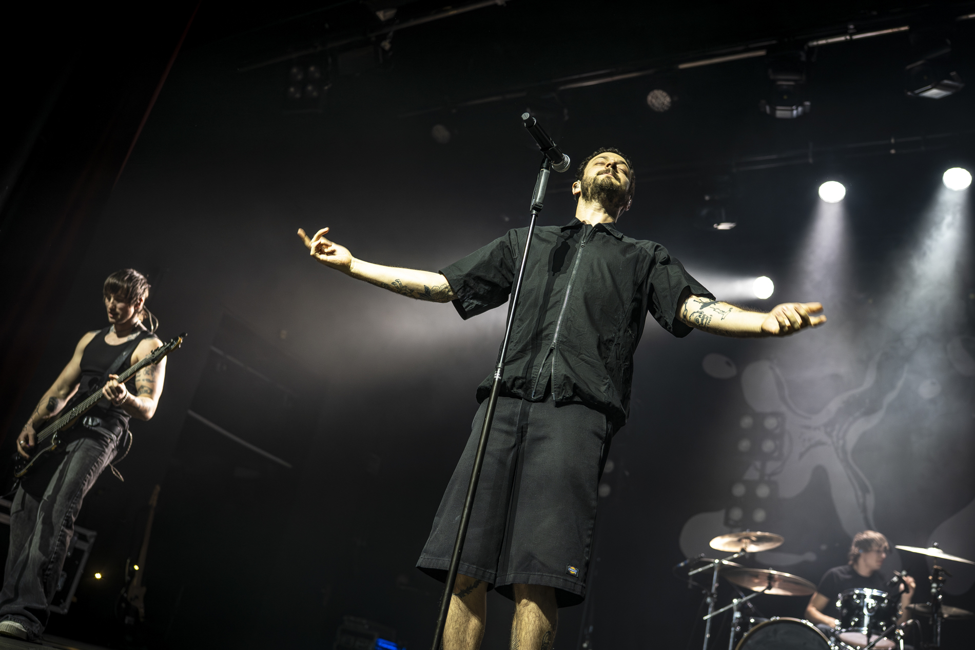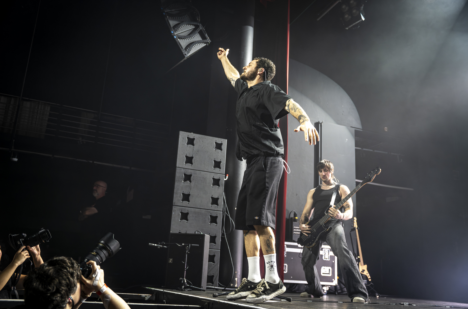 Dès les premières minutes, le ton est donné : une performance viscérale, nerveuse, presque cathartique. Les morceaux issus de son album INERTIA prennent une dimension encore plus brute en live, notamment “GOD IS AN ANIMAL”, “SELF IMMOLATION” et “BRAINROT”, brûlots politiques qui déclenchent une réaction immédiate du public. Entre deux titres, Jordan Benjamin prend le temps de s’adresser la foule, évoquant l’importance de la solidarité, de l’engagement et de la non-frontière entre les peuples, les orientations sexuelles ou encore les religions, thèmes centraux de sa musique.