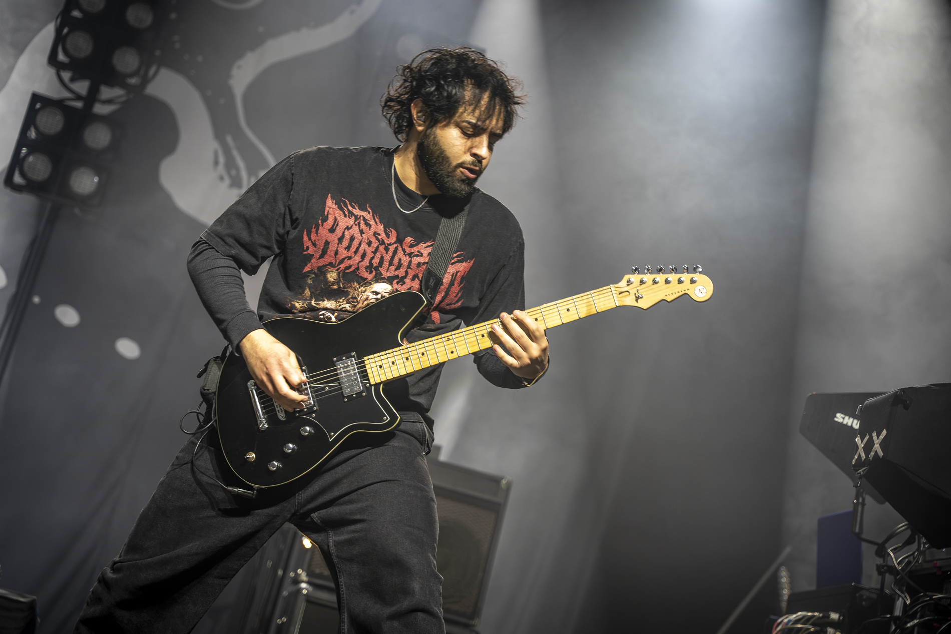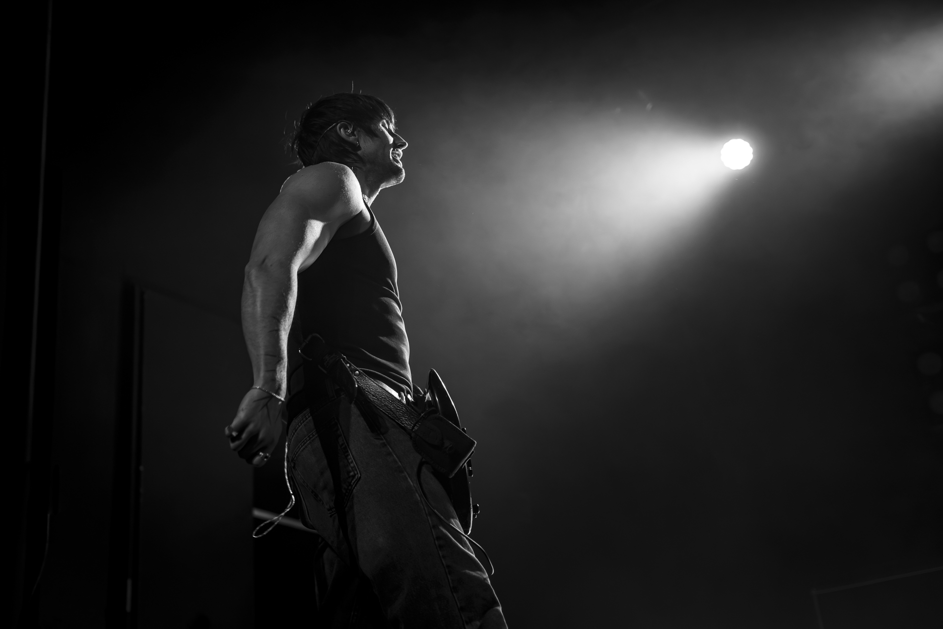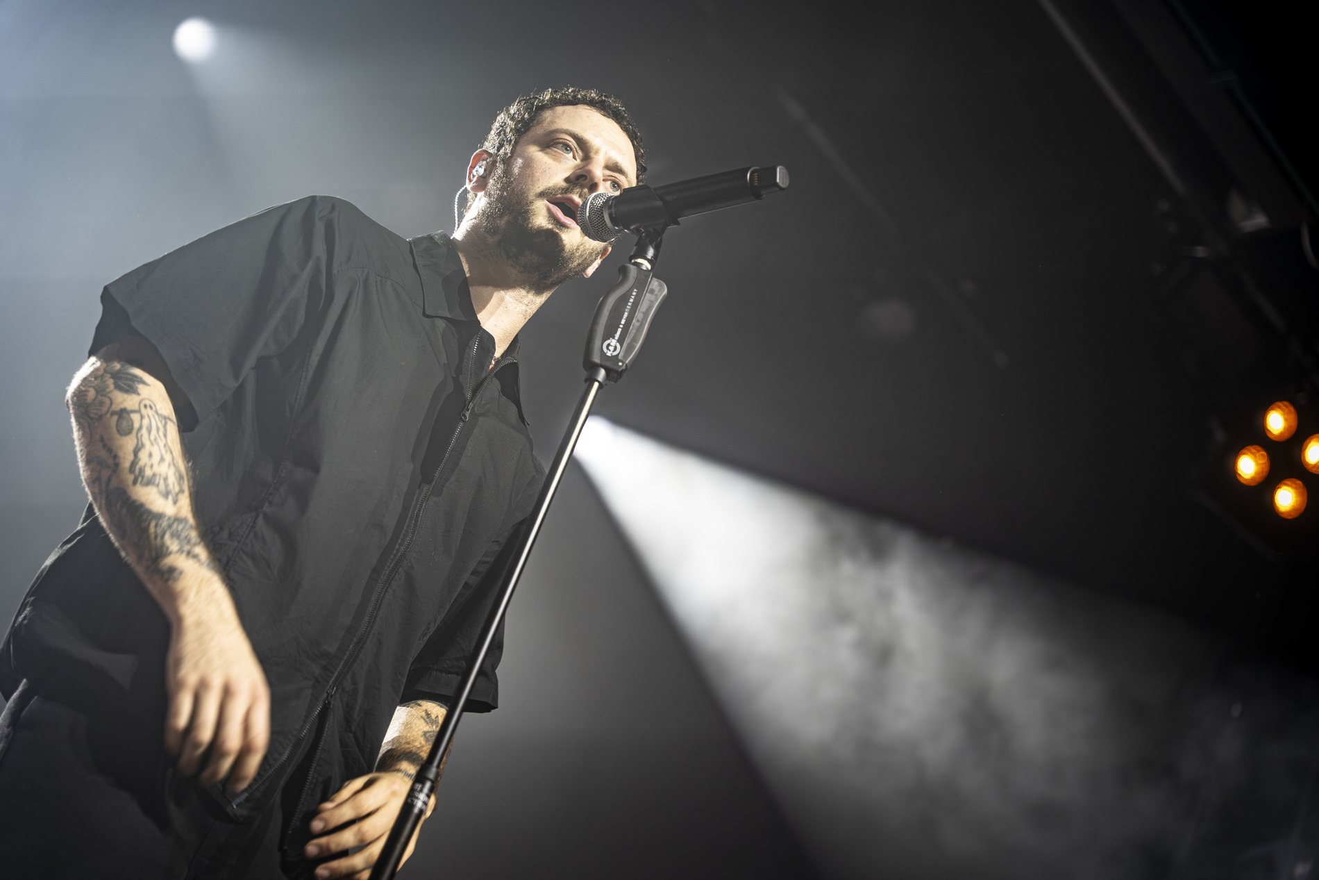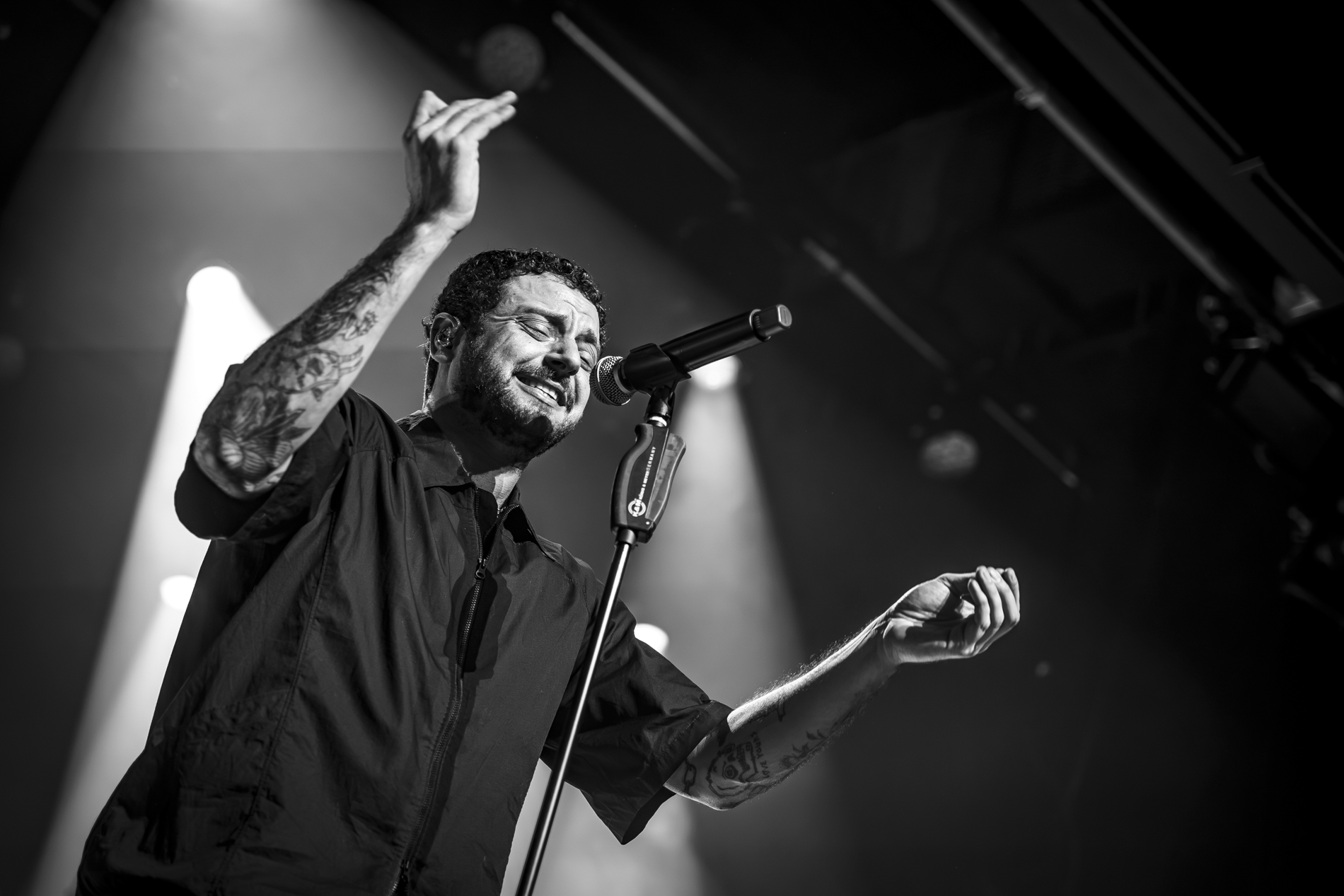 Dès les premières minutes, le ton est donné : une performance viscérale, nerveuse, presque cathartique. Les morceaux issus de son album INERTIA prennent une dimension encore plus brute en live, notamment “GOD IS AN ANIMAL”, “SELF IMMOLATION” et “BRAINROT”, brûlots politiques qui déclenchent une réaction immédiate du public. Entre deux titres, Jordan Benjamin prend le temps de s’adresser la foule, évoquant l’importance de la solidarité, de l’engagement et de la non-frontière entre les peuples, les orientations sexuelles ou encore les religions, thèmes centraux de sa musique.