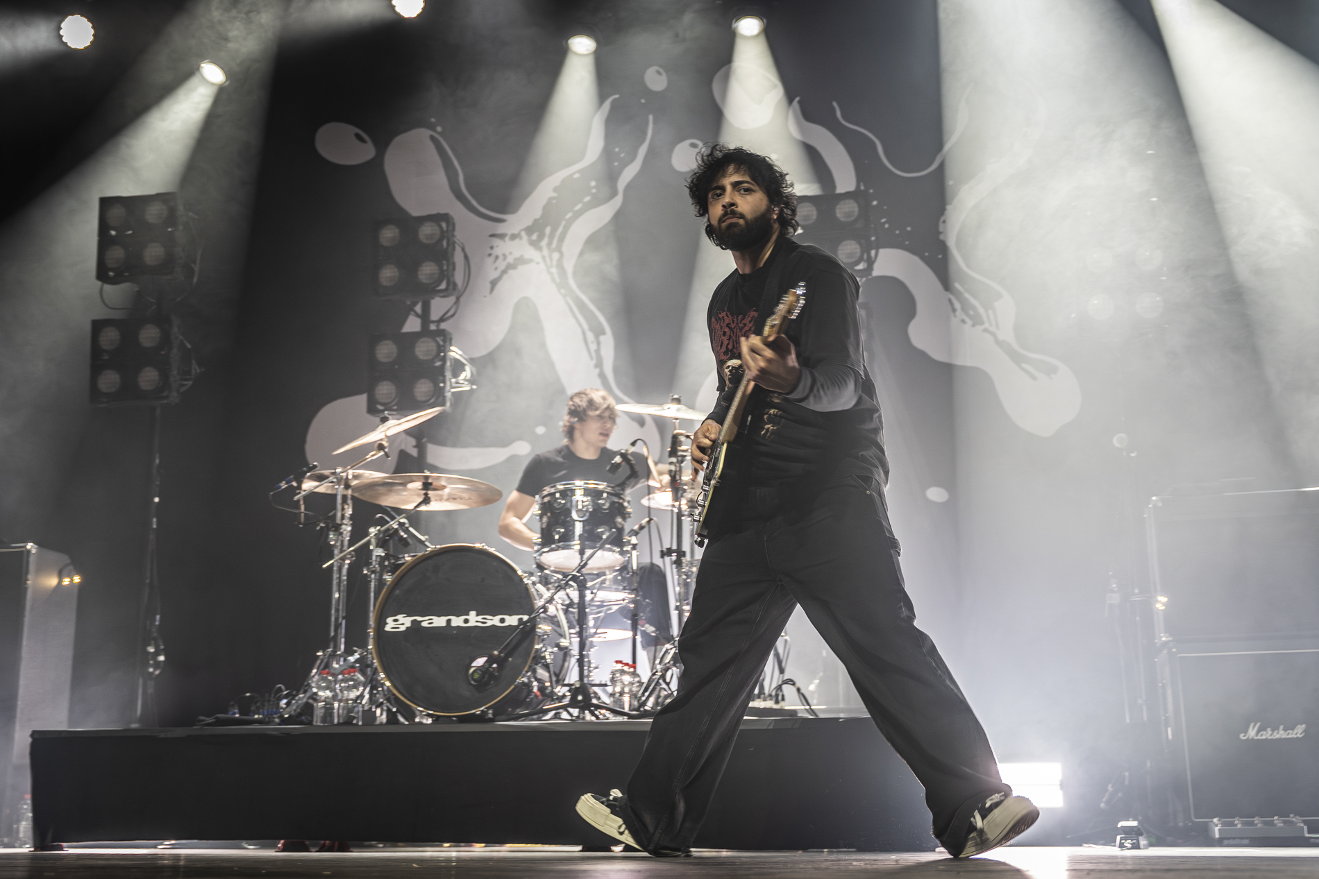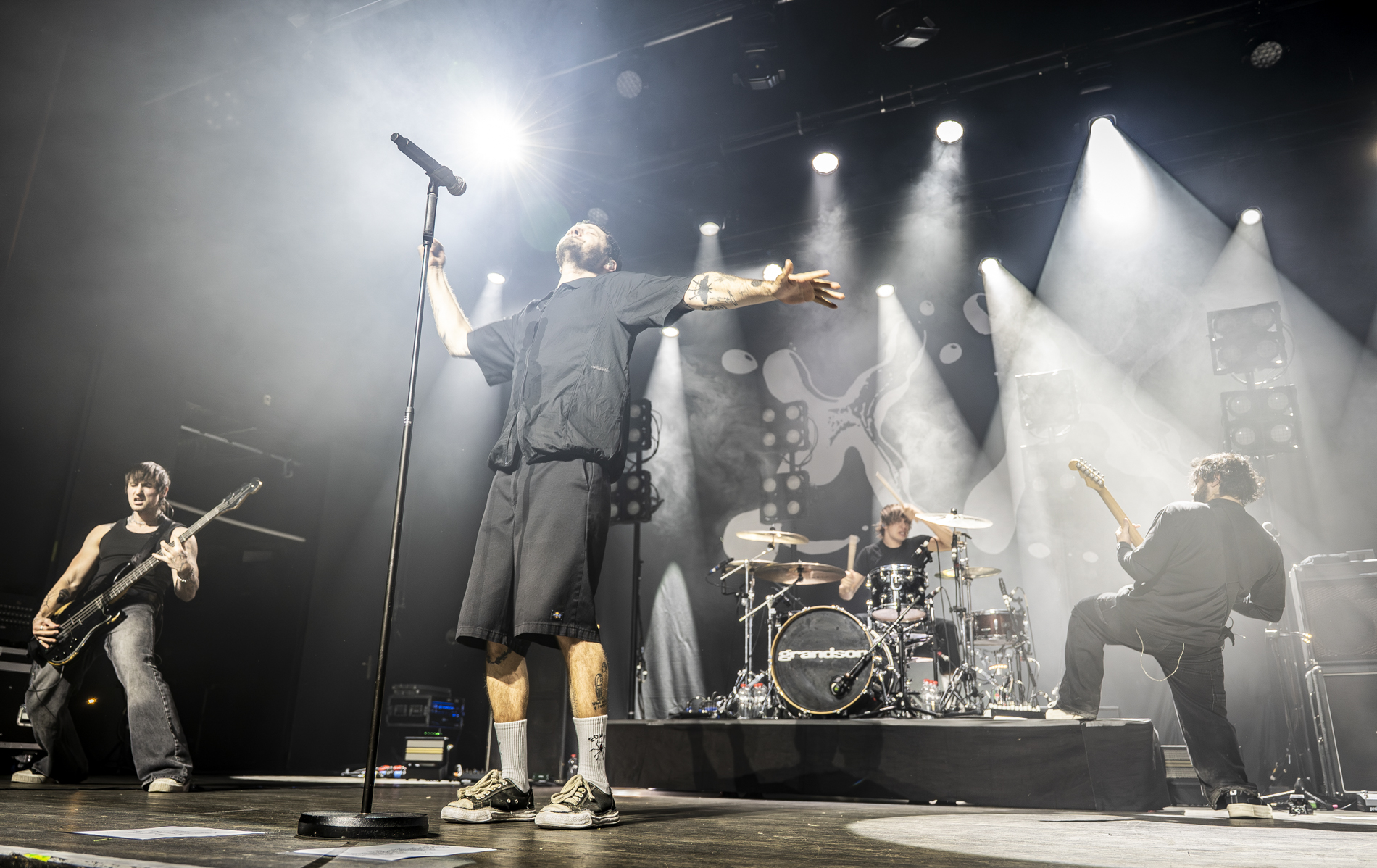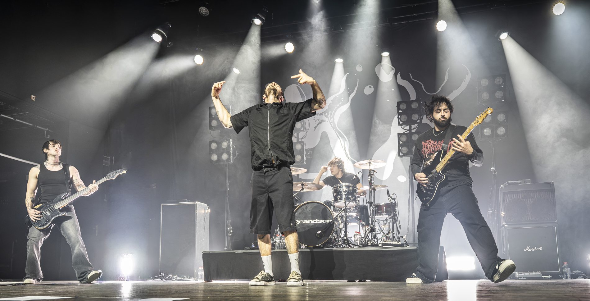 La soirée démarre fort avec les Américains de Pinkshift, dont le punk furieux chauffe déjà une foule prête à en découdre. Mais lorsque les lumières s’éteignent et que les premières nappes électroniques résonnent, c’est un véritable déferlement qui s’abat sur la salle. Grandson débarque sur scène avec l’intro martiale de “AUTONOMOUS DELIVERY ROBOT”, immédiatement suivie de “BURY YOU” et “We Did It!!!”, transformant le parterre en un premier pogo massif.