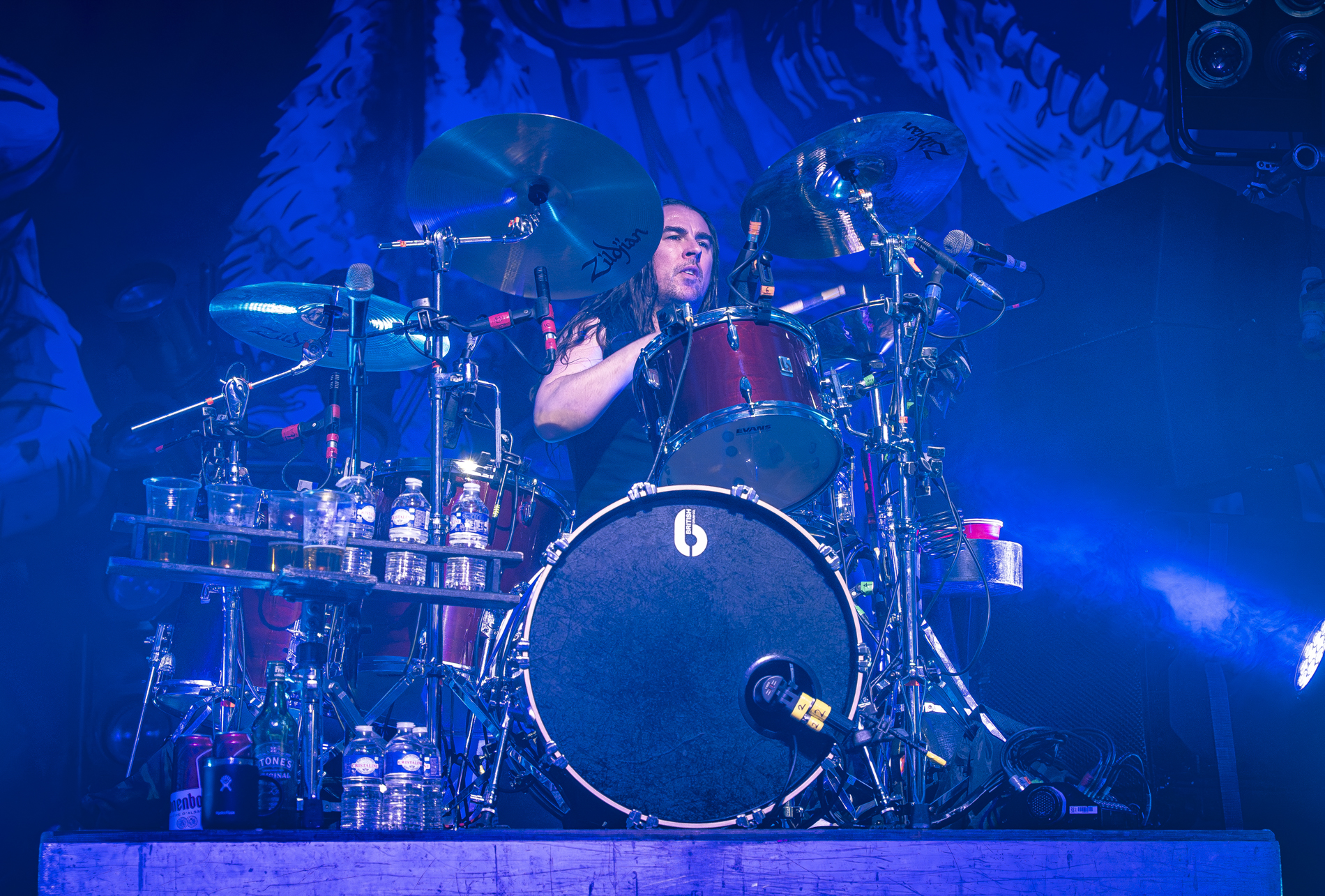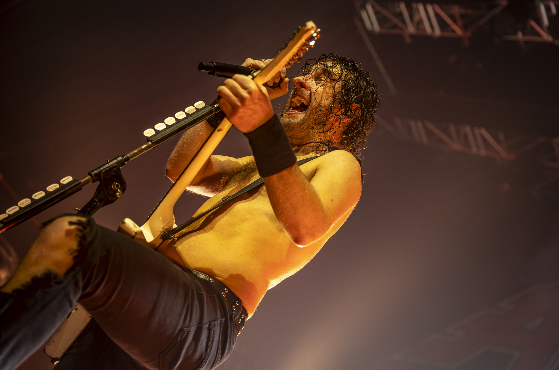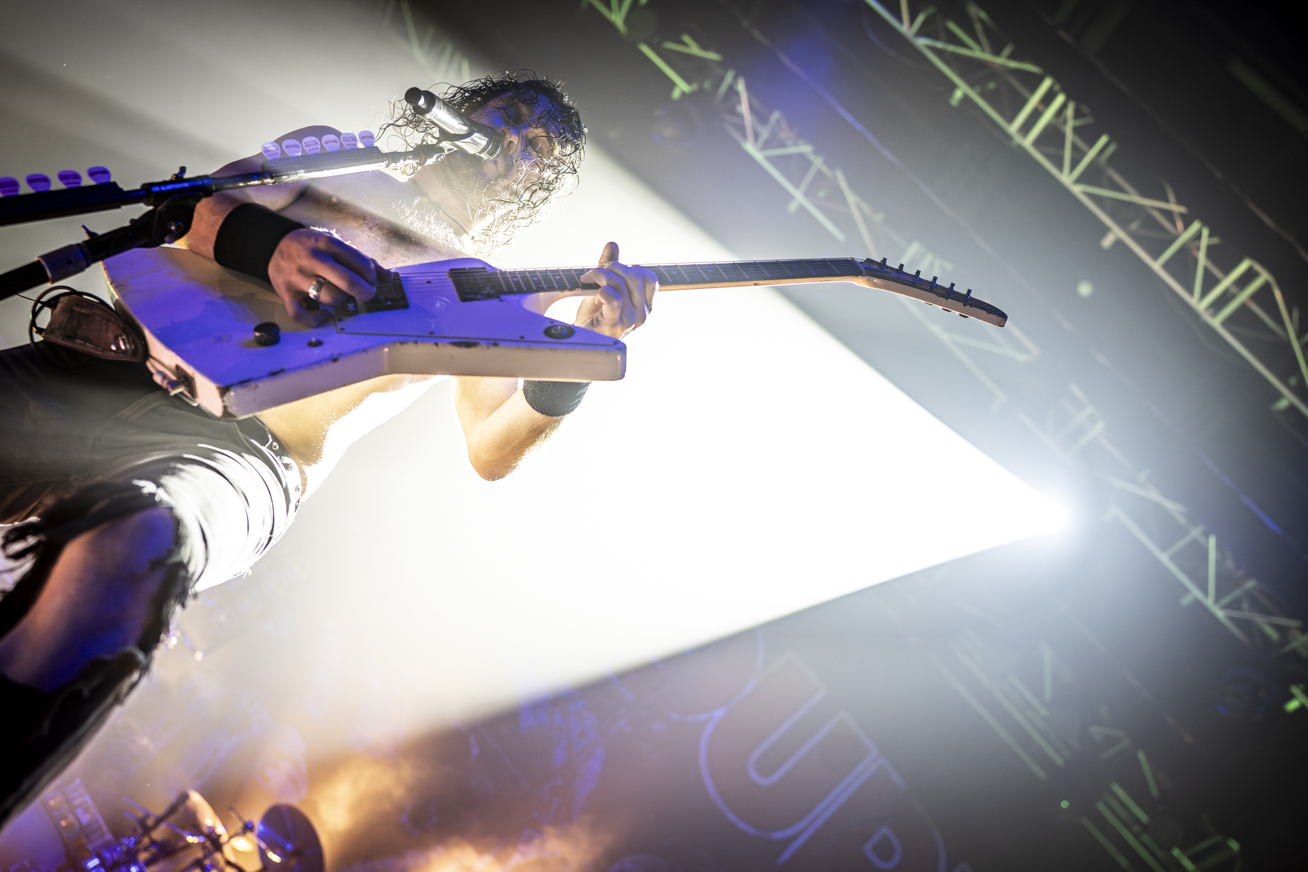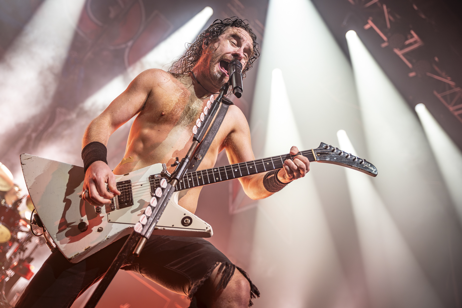 Puis le moment tant attendu sur « Raise the flag », le frontman, perché sur les épaules d’un roadie, traverse la foule tout en lâchant un solo incandescent, se terminant par son habituel explosion de canette de bière sur la tête. Une scène à la fois chaotique et parfaitement maîtrisée, qui résume à elle seule l’esprit du groupe.