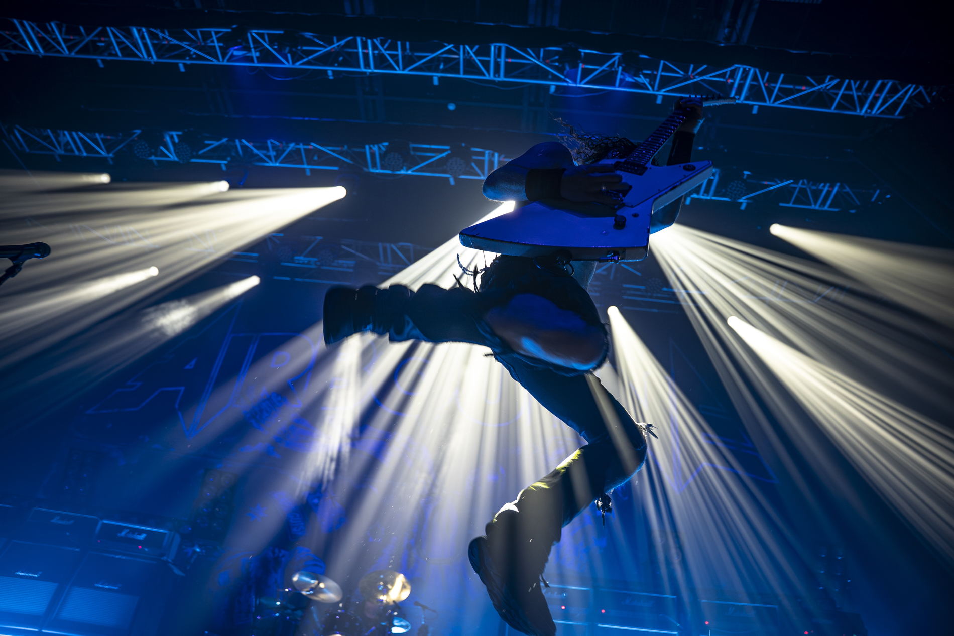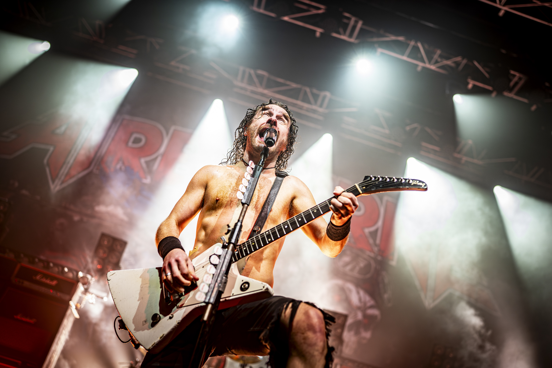 Dès l’ouverture avec “Gutsy”, le ton est donné : guitares acérées, rythmique martiale, et une présence scénique immédiatement explosive. Joel entre en scène comme un homme en mission, haranguant la foule avant d’enchaîner avec un “Too Much, Too Young, Too Fast” qui fait instantanément basculer la fosse dans le chaos, et les premiers rangs dans un headbanging des plus virulents.