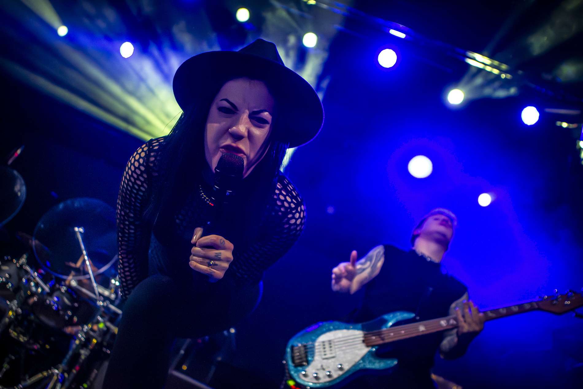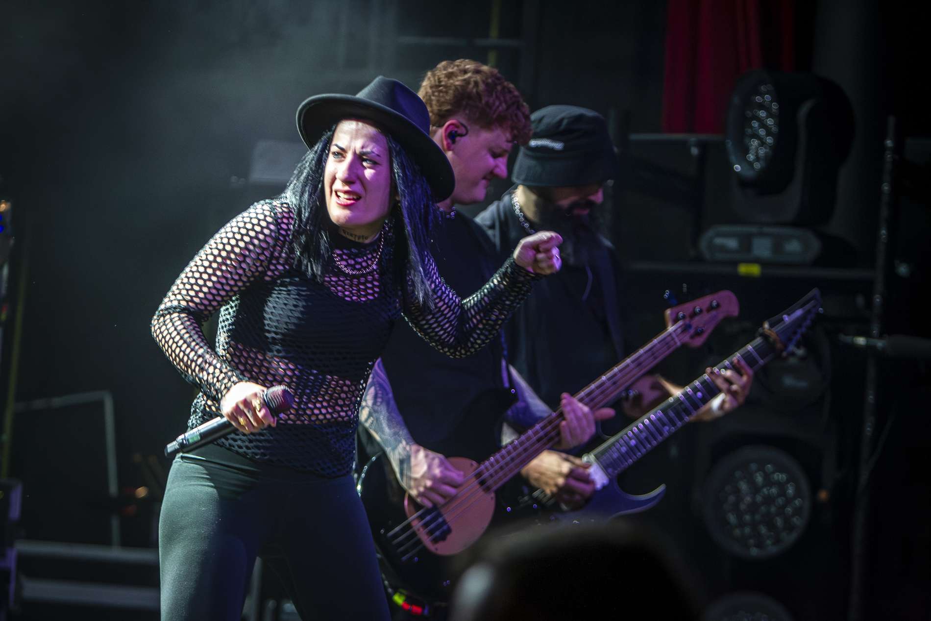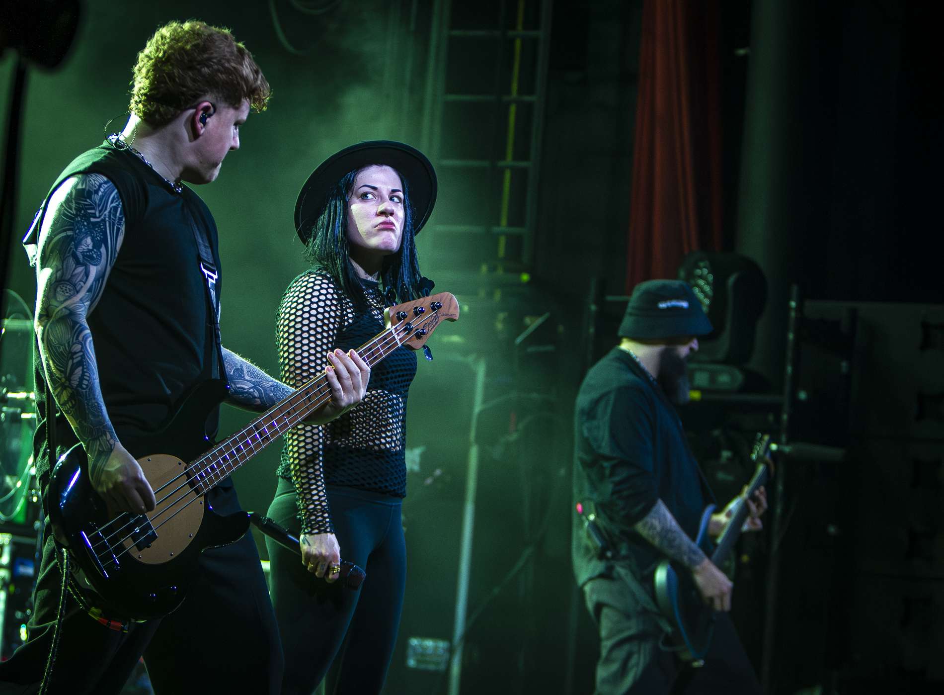 En deuxième partie, l’ambiance monte crescendo avec l’arrivée de Setyoursails sur scène. Un groupe de metalcore allemand qui a été créé en 2016 avec, à sa tête la chanteuse Jules Mitch. L’univers reposant qu’on a pu vivreprécédemment est remplacé par une énergie débordante du groupe qui interagit énormément avec son public. Vêtue de noir avec son chapeau, Jules veut faire passer un message important en brandissant un drapeau noir sur lequel est écrit en gros « No place for homophobia, fascism, sexism, racism ». Elle souhaite faire de la fosse un endroit de paix où tout le monde est accepté comme il est. Setyoursails est une très belle découverte qui dégage une belle énergie sur scène.
